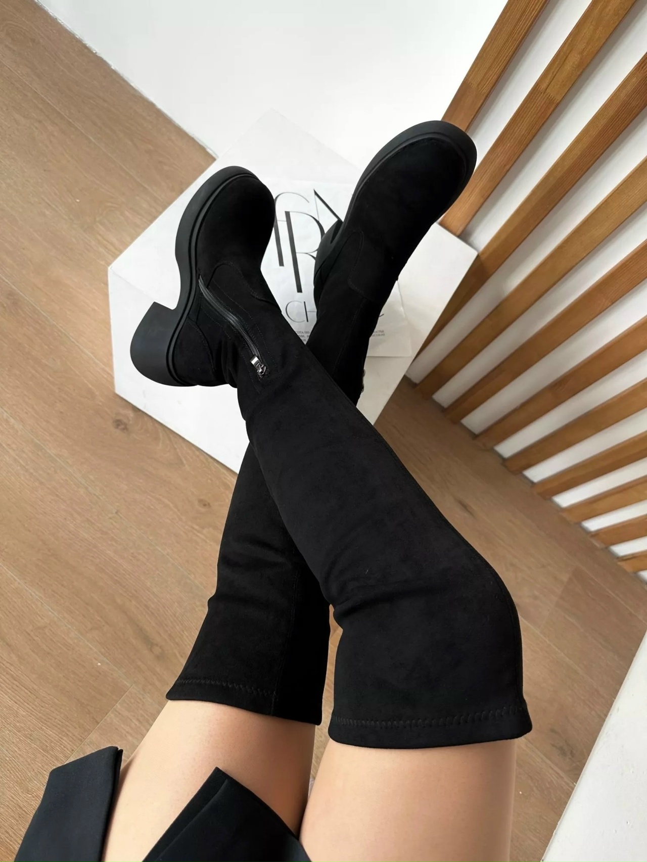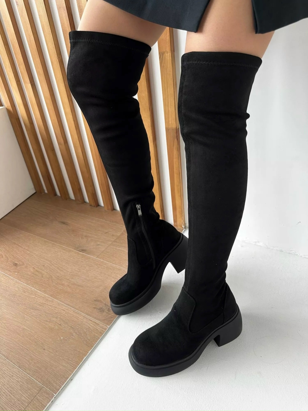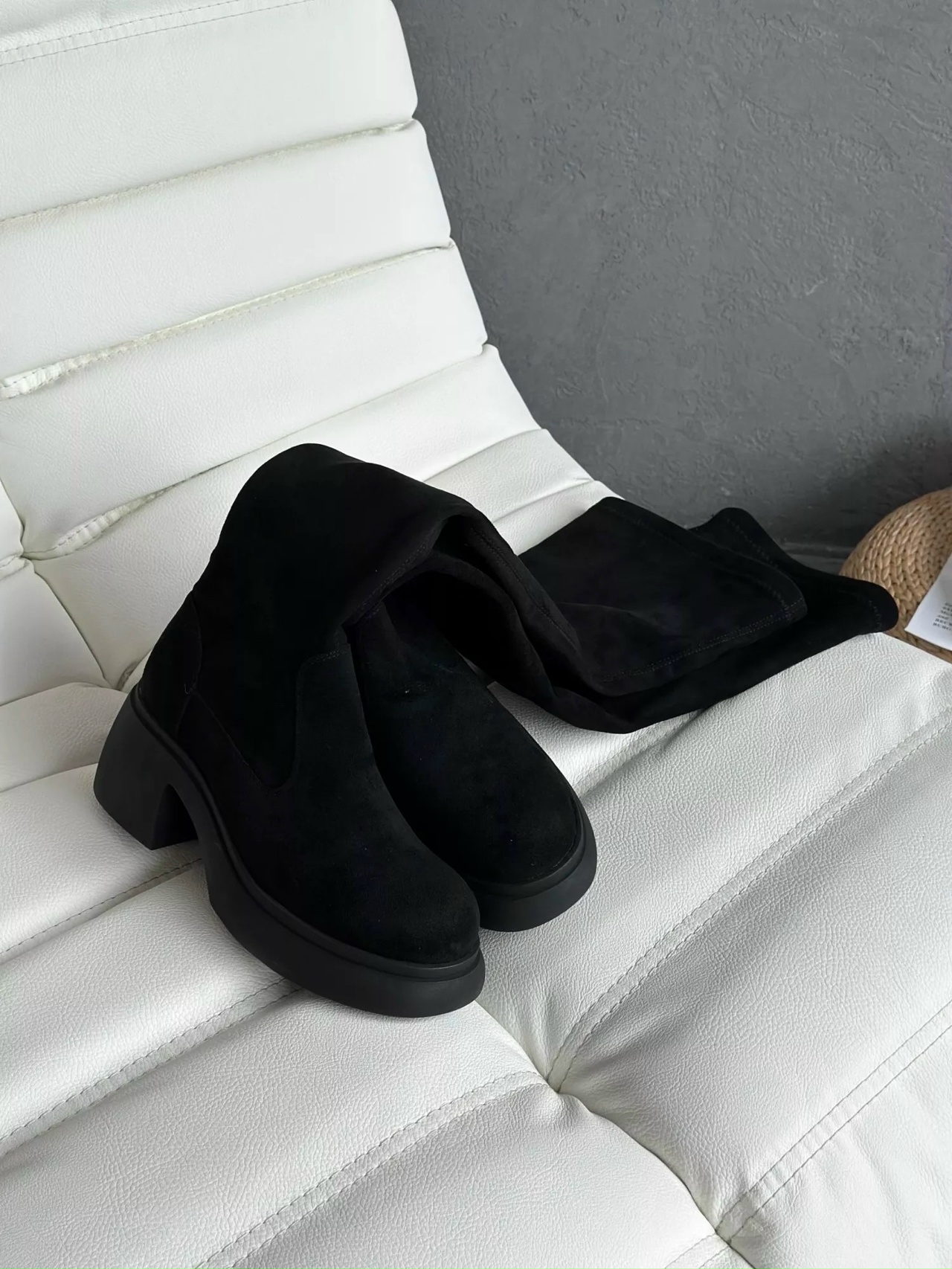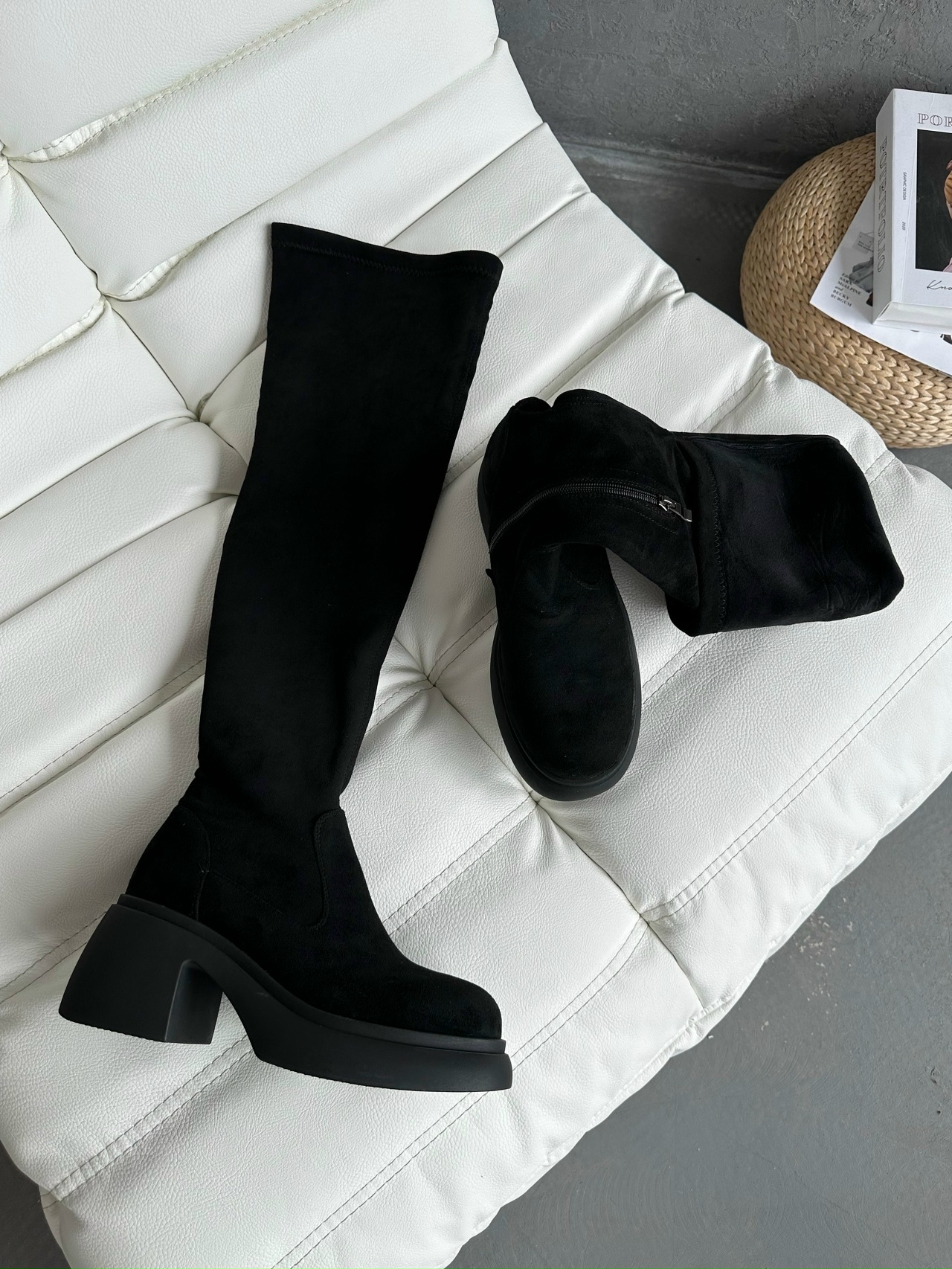 Материал верха — замша-стрейч, обхват по голени 32/38 см, обхват по верху 38/46 см, высота сапог от подошвы 54 см , платформа 3 см, каблук 6,5 см