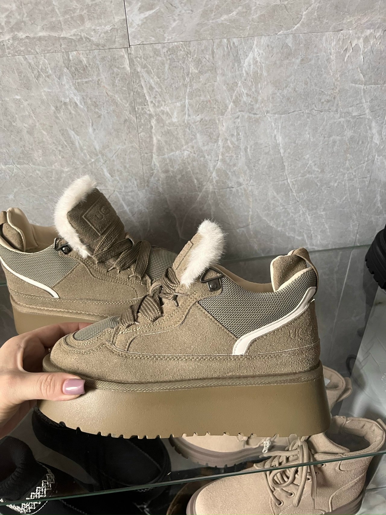 Материал верха — замша с пропиткой, ТПУ подошва 3,5  см, утеплитель мех